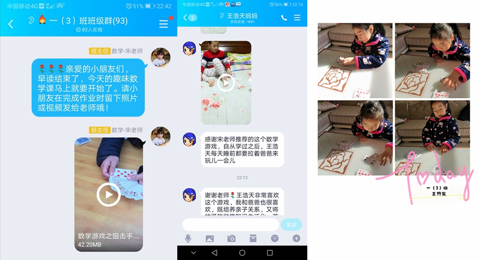经历了一段时间的摸索之后,我充分发掘了手机的各项功能,一部智能手机被我玩出了“微型电脑”的效果,遇到手机着实难以解决的问题,我便“远程遥控”远方的爱人帮我解决。“网络教学”的工作渐渐顺手,我也慢慢接受了这个新颖的教学模式,每天充实地忙碌着。作为班主任,每天线上关心孩子的健康状况,督促孩子学习、锻炼,安抚焦虑的家长;作为数学老师,备课、布置作业、批改作业、反馈作业、答疑解惑等一系列操作行云流水。脑壳终于不疼啦,我觉得自己也还行嘛!
