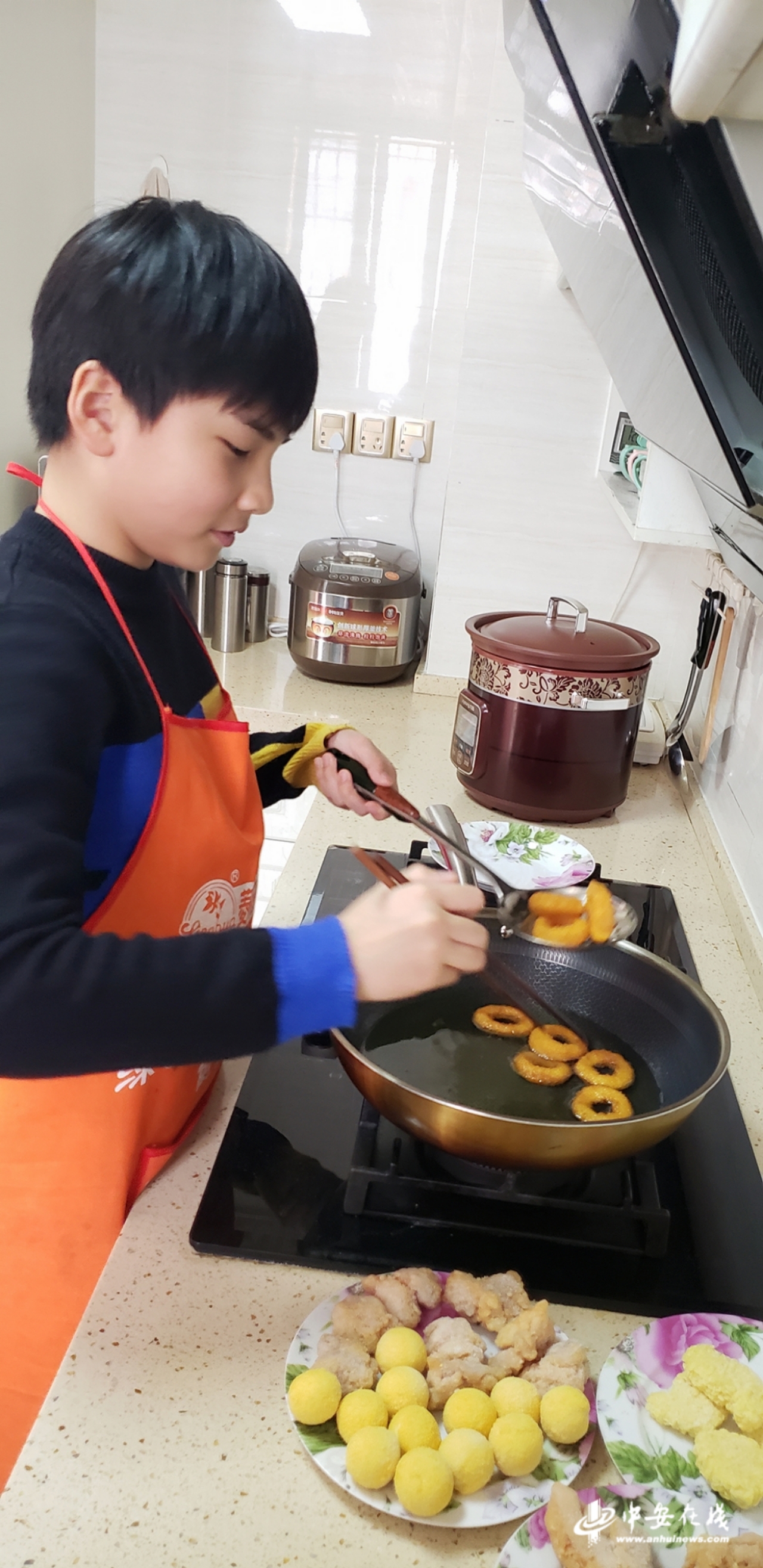 炸春卷,炸鱿鱼圈,炸鸡块,炸丸子……最近一周,合肥168玫瑰园学校五年级学生周禹赫每在班级QQ群相册里上传一张照片,都会让班主任兼语文老师张菁眼前一亮。这个印象中爱运动的阳光男孩,最近爱上了食谱,扎起了围裙,成为一名炸货能手。