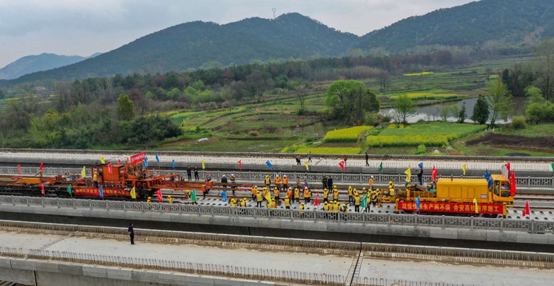 3月26日上午,在安庆市茶岭村,铁路有砟无砟一体式牵引车顺利将合肥至安庆高铁正线最后一对轨排落到承轨槽,这标志着合安高铁正线铺轨完成。(刘大勇 摄)