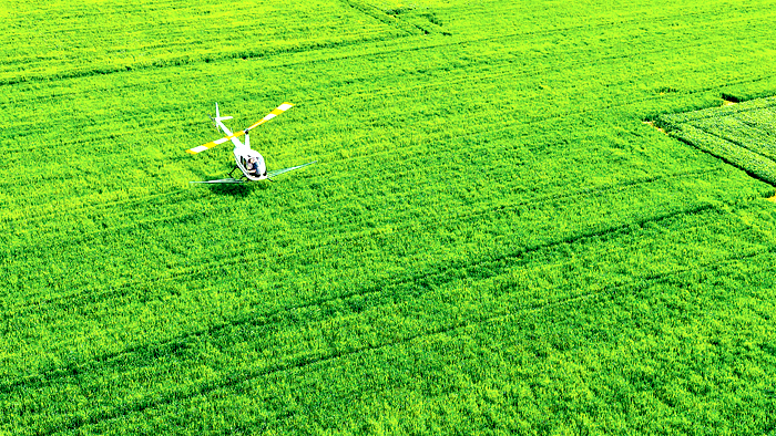 在素有“淮上粮仓”之称的霍邱县临淮岗乡下姜台村,农用直升机在对小麦种植区域展开飞防作业。通讯员 田凯平 摄