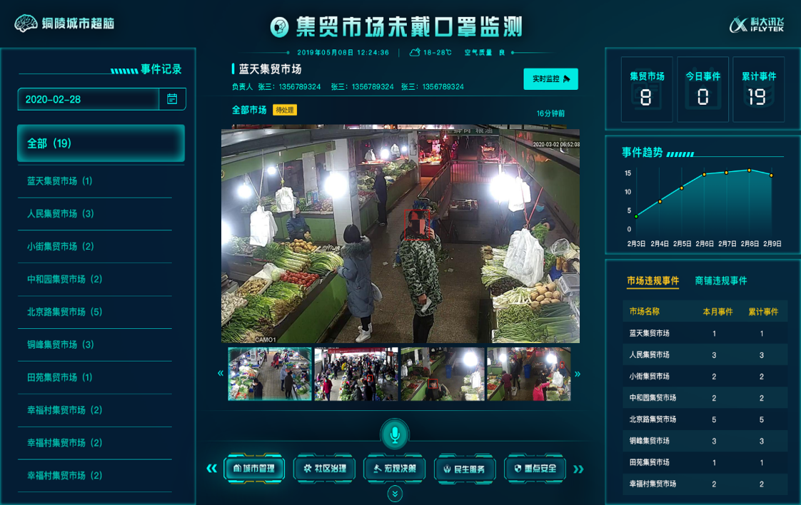 疫情期间,“城市超脑”进行农贸市场未戴口罩预警干预,抓拍分析未佩戴口罩人员并及时推送给市场管理人员,及时进行劝导处置,守护集贸市场安全。