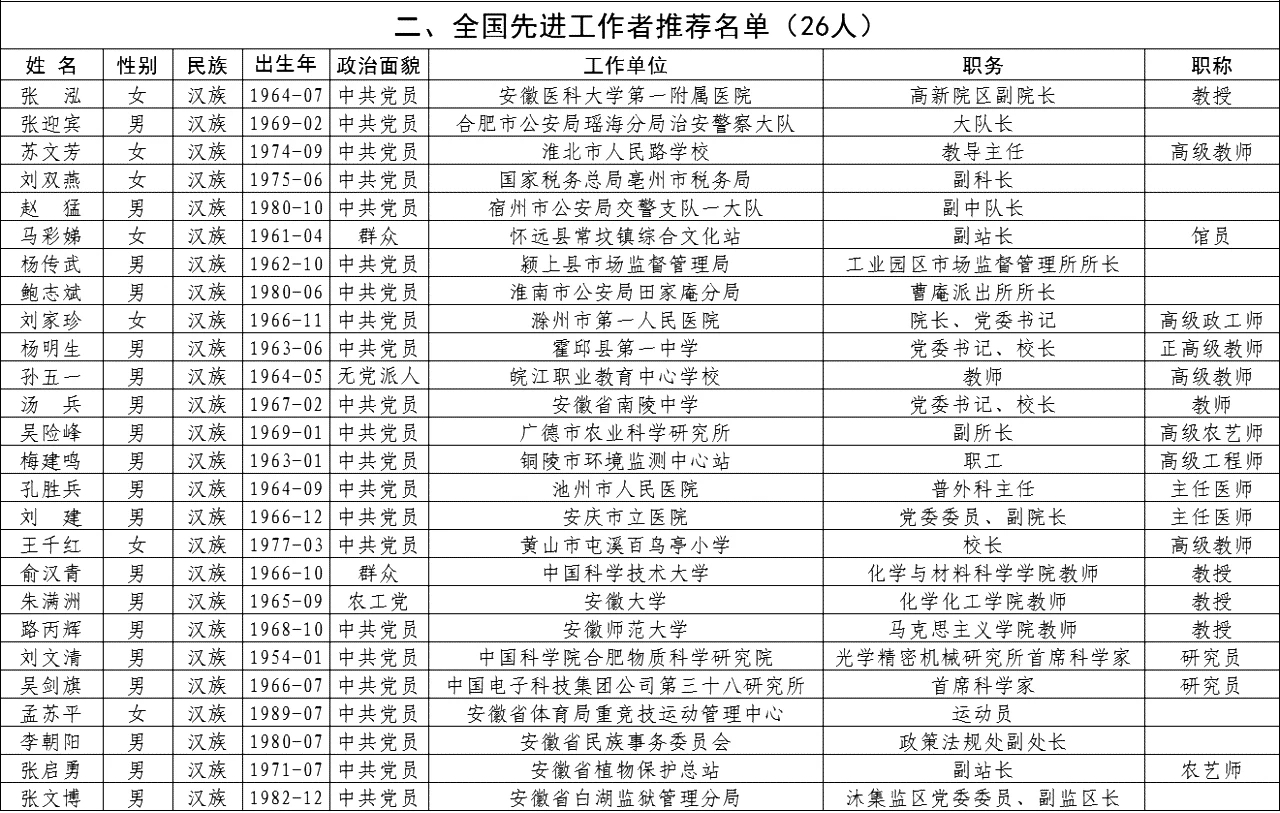 安徽省2020年全国劳动模范和先进工作者推荐人选公示公告