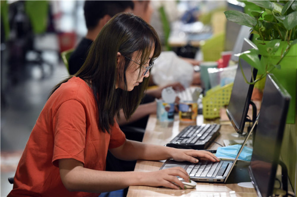 ↑5月12日,在位于芜湖市的三只松鼠股份有限公司,通过今年校招入职的管培生方颖在工作。新华社发(周牧摄)