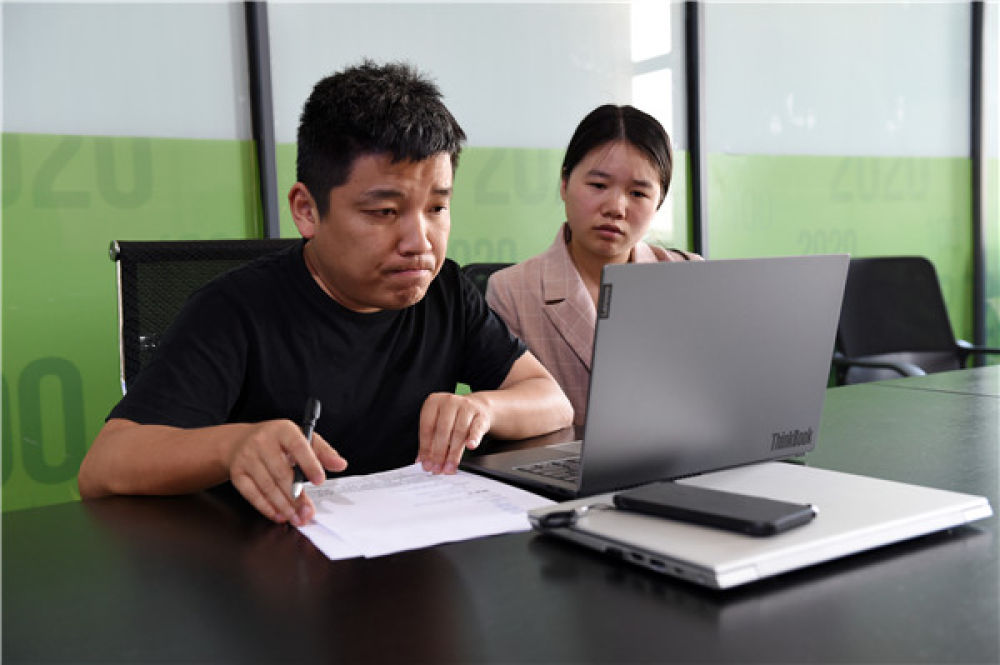 ↑5月12日,在位于芜湖市的三只松鼠股份有限公司,工作人员通过视频面试求职者。新华社发(周牧摄)