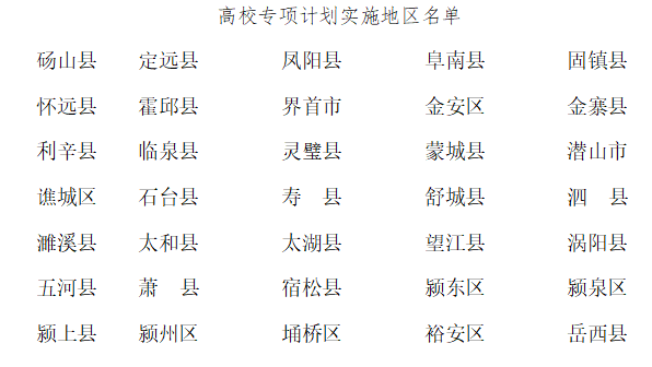 安徽省高校专项计划实施区域为安徽列入国家集中连片特殊困难县、国家级扶贫开发重点县、省扶贫开发工作重点县(市、区)和省扶贫开发连片地区县(市、区),共35个。报考高校专项计划的考生,本人及父亲或母亲或法定监护人户籍地应在实施区域的农村,本人具有当地连续3年以上户籍,在户籍所在县高中连续3年学籍并实际就读,且高考成绩达到报考院校所在批次线。