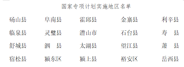 安徽省国家专项计划实施区域为安徽列入国家集中连片特殊困难县和国家级扶贫开发重点县,共20个。报考国家专项计划的考生本人必须具有实施区域当地连续3年以上户籍,其父亲或母亲或法定监护人具有当地户籍;本人在户籍所在县高中连续3年学籍并实际就读,且高考成绩达到报考院校所在批次线下20分以内。