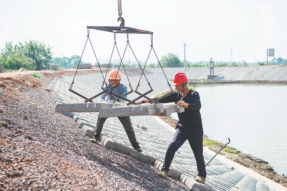 5月26日,引江济淮工程庐江县万山镇段,中铁二十局的建设者们正在进行河渠边坡筑建作业。本报通讯员柳晓华 摄