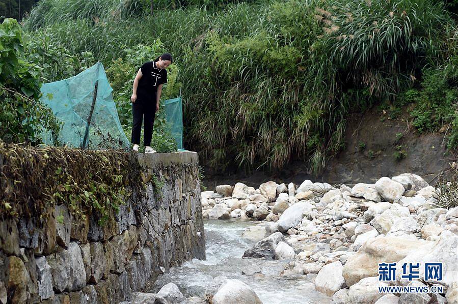 在安徽省岳西县来榜镇公山村,汪链在检查村里新修建的河坝(6月24日摄)。 新华社记者 周牧 摄