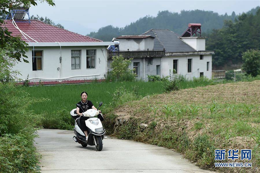 在安徽省岳西县来榜镇公山村,汪链骑车出行工作(6月24日摄)。 新华社记者 周牧 摄