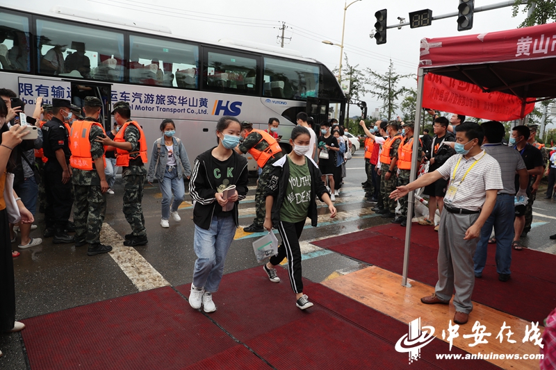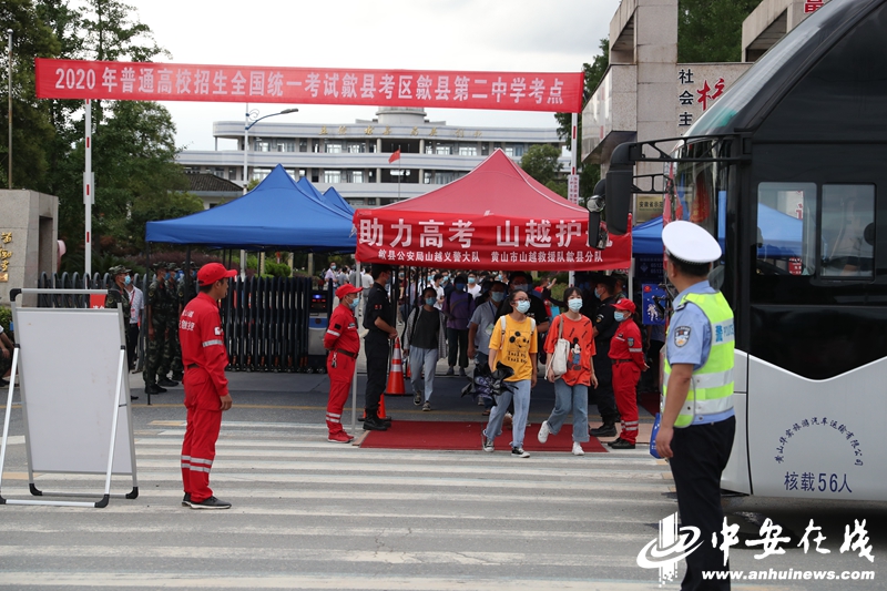 在歙县二中考点,考场外悬挂着“加油!乘风破浪的少年们!”“十年磨一剑,风雨未曾阻挡”等口号标语。由消防、武警、交通、卫生和志愿者等组成的保障队伍在现场维持秩序,考生们乘坐政府组织的客车从县城内的集中接驳点赶往考点。