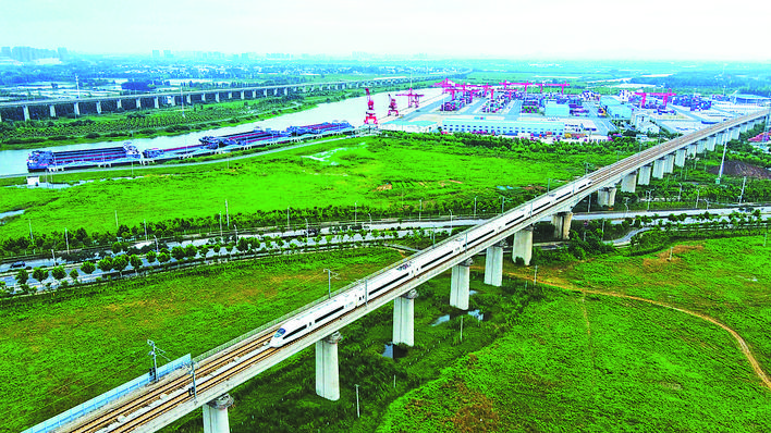 7月12日,和谐号列车从合肥港旁飞驰而过