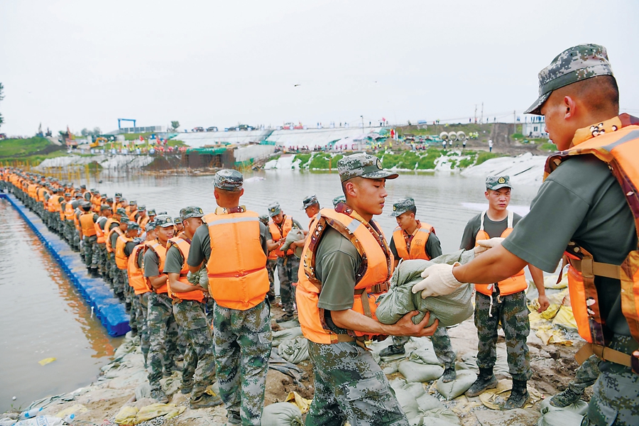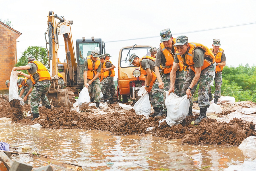 7月12日,铜陵市郊区大通镇和悦洲,东部战区陆军某旅指战员在加固圩堤。连日来,铜陵市长江段全线超警戒水位,防汛救灾任务艰巨。东部战区陆军某旅150余名指战员迅速驰援,与当地干群一起抢险救灾。 本报通讯员 陈磊 摄