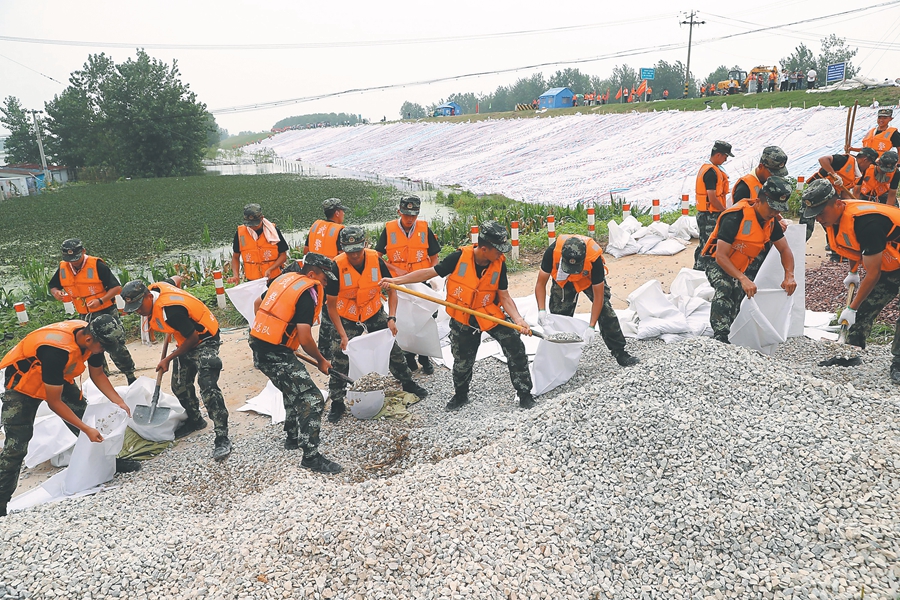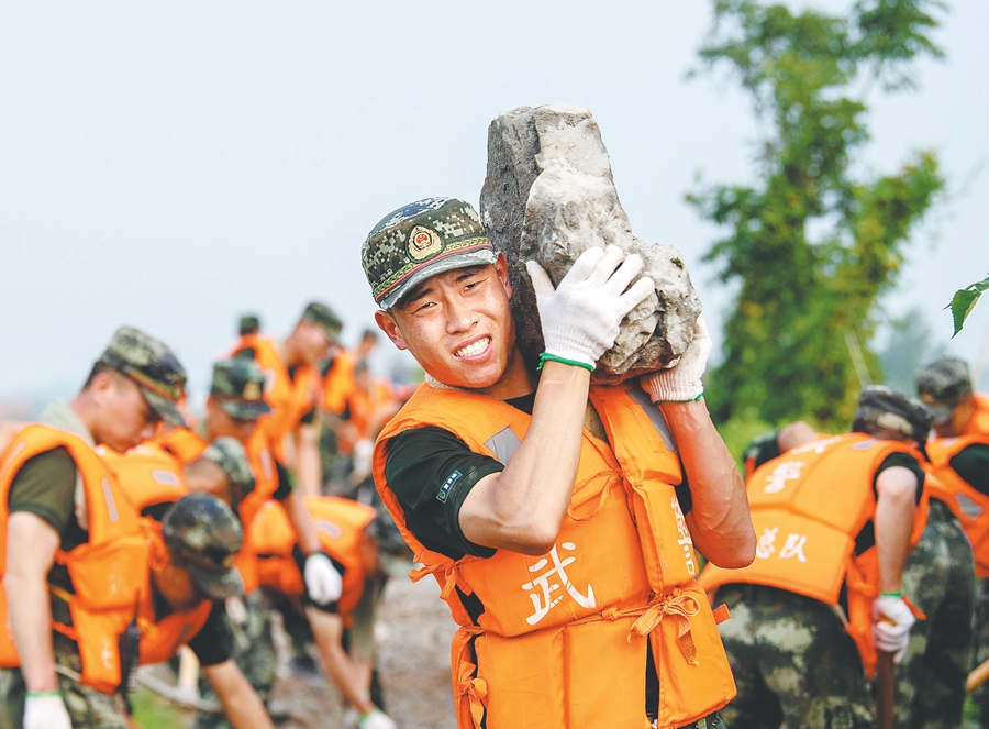 7月14日下午,望江县华阳镇大治圩运输物资的防汛道路损毁严重,武警安徽省总队机动支队、望江县人武部官兵进行紧急加固。 本报记者 李博 摄
