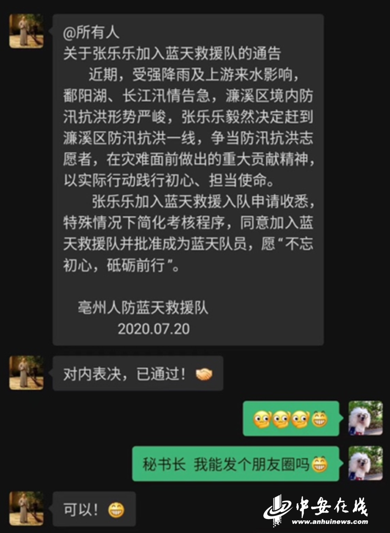 张乐乐温暖人心的举动,在安徽、江西两地引发了热议。亳州蓝天救援队20日“火线“通过了他的申请,通告中写道:长江汛情告急,张乐乐毅然决定感到抗洪一线,在灾难面前做出的重大贡献精神,以实际行动践行初心,担当使命。张乐乐加入蓝天救援队申请收悉,特殊情况下简化考核程序,同意加入蓝天救援队并批准为蓝天成员,愿‘不忘初心,砥砺前行’。”