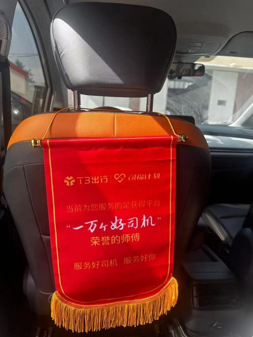 长春的活动中,T3出行不仅给司机师傅们准备了丰厚的礼品,还为“一万个好司机”项目的司机师傅们颁发了锦旗。获得锦旗的师傅们可以将其挂在车内向乘客展示。