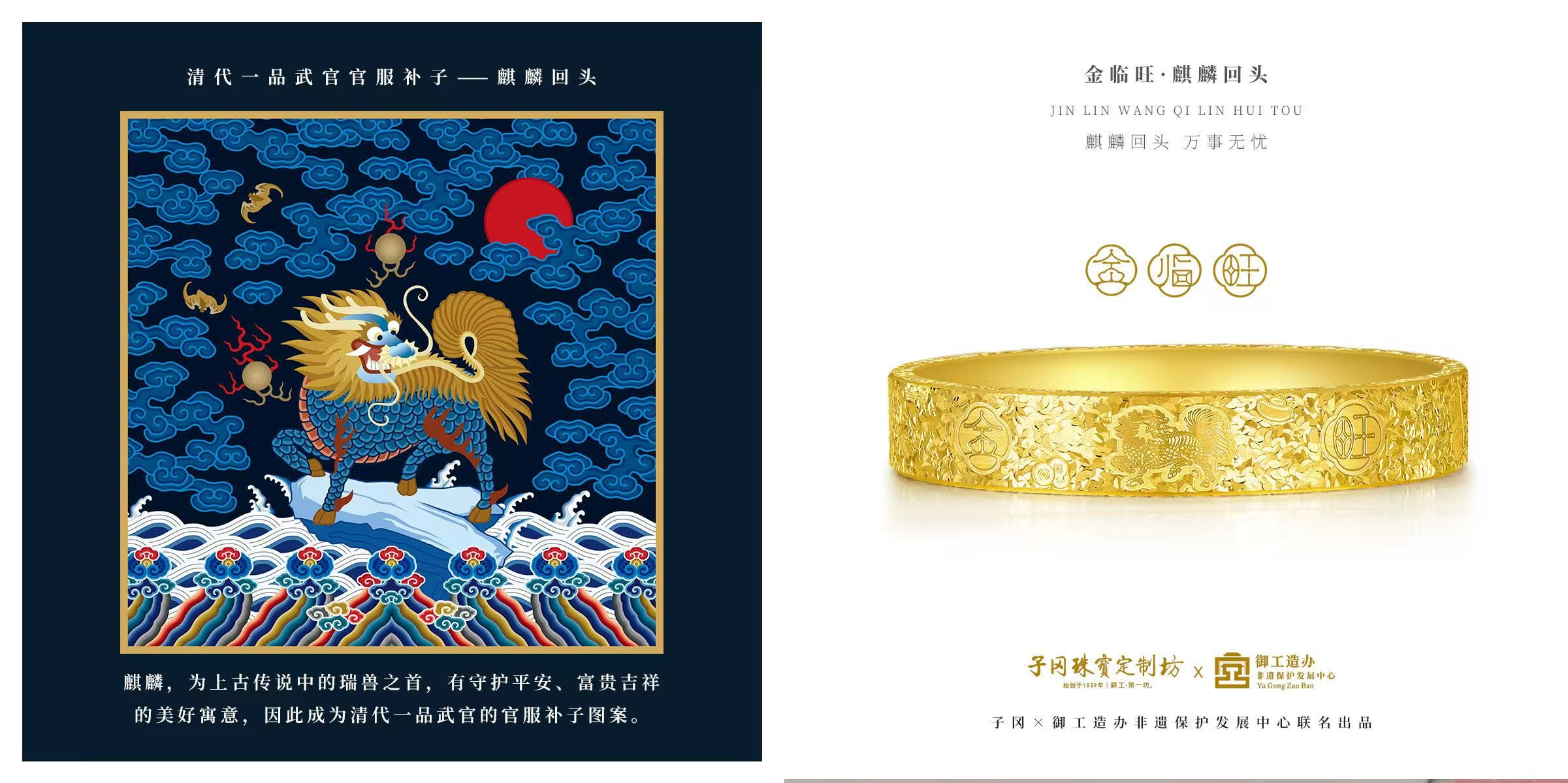 子冈的火爆并非偶然,而是多年坚持“非遗+设计”的成果。作为金银细作技艺的保护单位,子冈在坚守手工工艺的基础上,不断从中国优秀传统文化中汲取灵感,开发出一系列“国潮”产品: