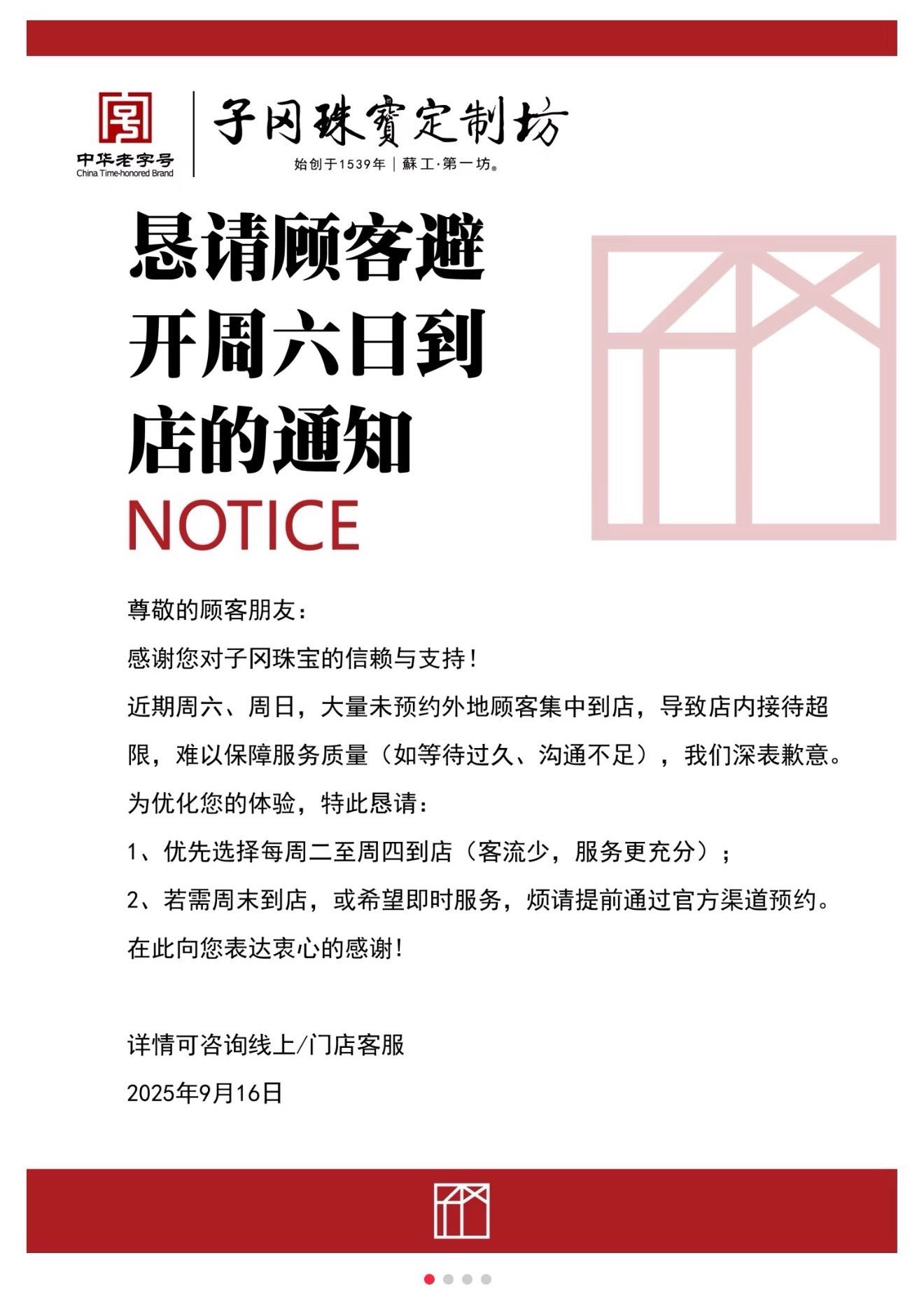 临近国庆节,苏州古城又一次因一则特别的通知“刷屏”。中华老字号、苏州金银细作非遗保护单位——子冈珠宝定制坊在官方抖音、小红书、视频号等账号上发布消息,恳请顾客尽量避开周六日高峰期到店。原因是:近期外地和外国游客蜂拥而至,周末客流量已远超承载能力,导致现场接待几近瘫痪。为了保障顾客体验,子冈建议更多游客选择周二、周三、周四前来,享受更从容的服务。