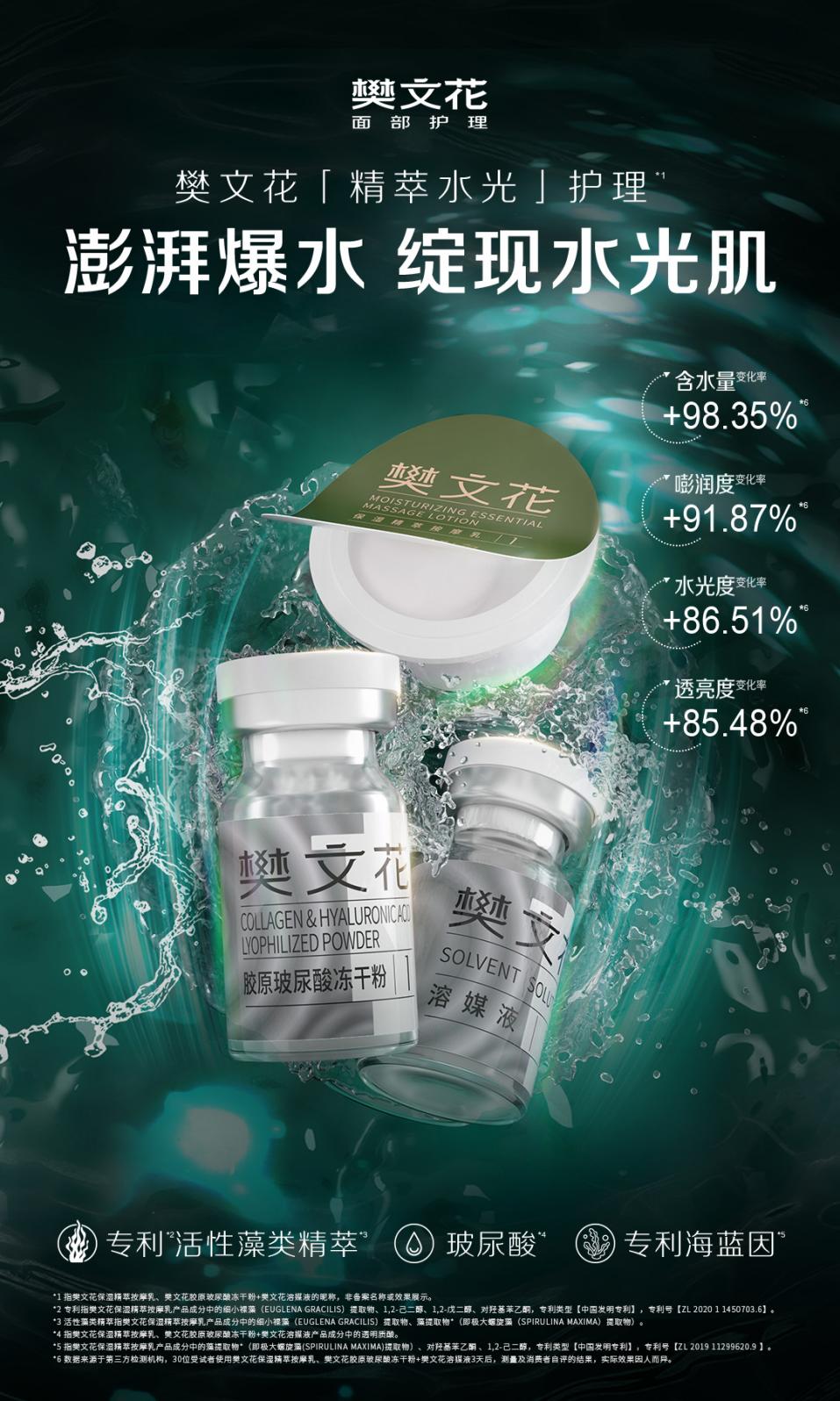 针对秋冬肌肤“补水难、保湿更难”的挑战,樊文花「精萃保湿」系列实现配方精准升级。产品特别添加专利活性藻类精萃、专利海蓝因,搭配专利4D透明质酸钠等成分,形成“多维补水 - 深润呵护 -长效保湿”的闭环,多重成分协同改善季节型干燥问题。配合樊氏面部护理手法,进一步提升成分吸收效率,打造高性价比的秋冬保湿体验。