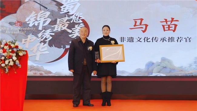 同时,马苗被正式聘任为四川中华文化促进会传统技艺专委会副秘书长。四川省非遗保护中心非遗评定专家委员会会长王力本为其颁发荣誉证书与奖杯,肯定其在非遗传播领域的积极贡献。马苗在发言中表示,将肩负起推广使命,以创新模式拓宽蜀锦传播路径,助力非遗融入现代生活。