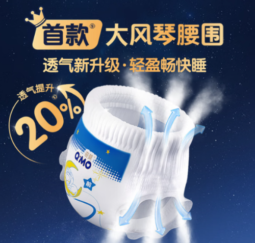夜间长时间穿着,对拉拉裤的透气性的要求更为严苛。奇莫甜梦星河拉拉裤首款大风琴腰围结构【6】,在保证贴合度的同时提升空气流通效率,整体透气性提升20%【7】,有效缓解闷热问题。