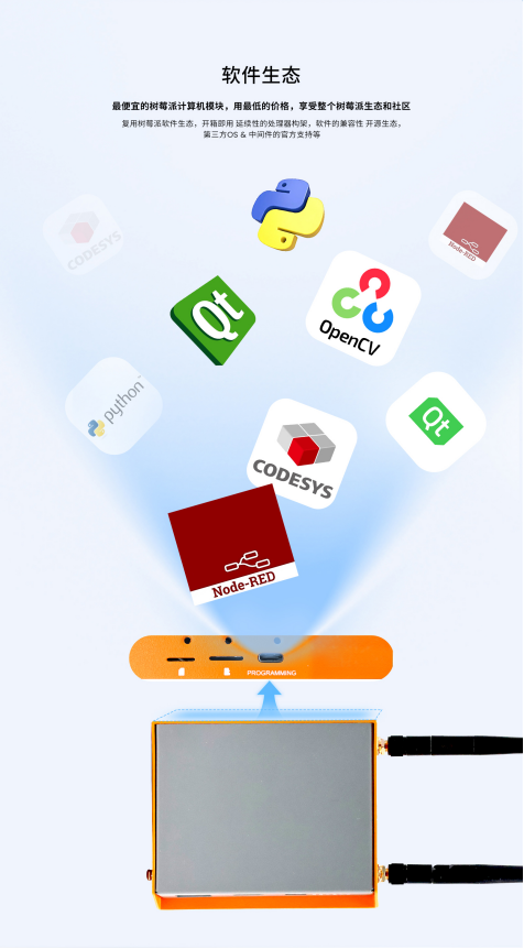 IPC1100兼容 Raspberry Pi 成熟的软硬件生态,得益于 Raspberry Pi OS,开发者和企业无需进行复杂的 Linux 内核开发,借助树莓派的 Device Tree Overlays(设备树叠加层)机制,像开启特定的接口、或是配置 GPIO 引脚等硬件操作,仅需通过简单的文本配置,即可动态启用或调整各类硬件功能。同时支持CODESYS、Node-RED、OpenCV等主流工具,结合树莓派庞大的开源社区资源,用搭积木的方式快速搭建应用程序。(中企经济网)
