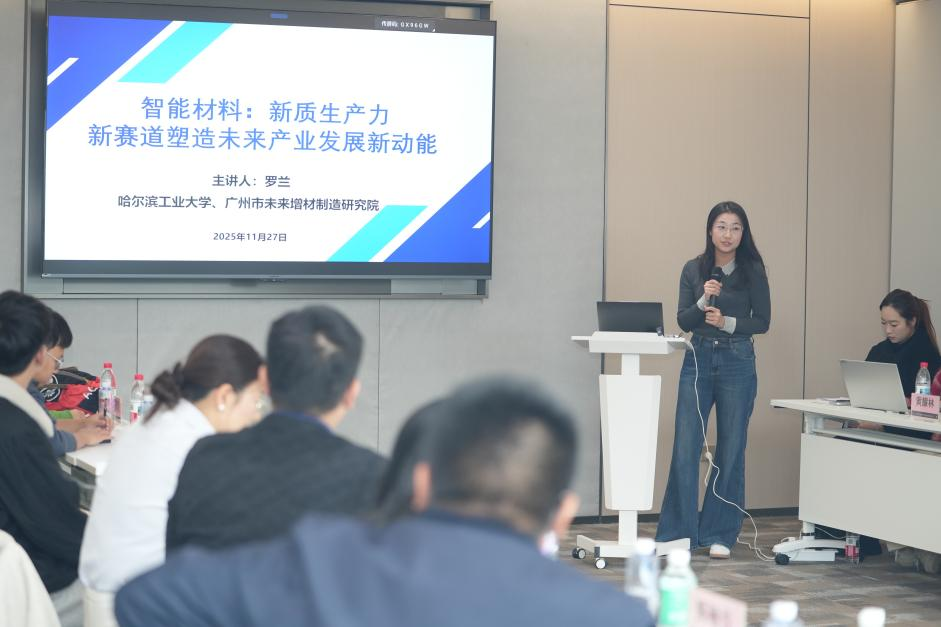 紧接着,广州市未来增材制造研究院研发顾问、哈尔滨工业大学副研究员罗兰为在场企业进行了前沿新材料行业知识分享。罗老师围绕增材制造关键技术开展讲解,展示4D打印在航天航空、生物医疗、智能材料、智能机器人、智能制造等领域的应用验证。