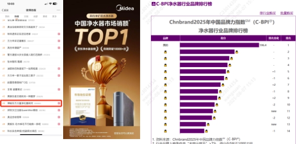 营销的终极目标,是让流量转化为认可与销量。这场 “全球出征” 交出了一份亮眼答卷:2024 年 8-10 月,美的净矿双水器斩获中国净水器市场销额第一,京东月销突破 10000 + 台;2025 年Chnbrand中国品牌力指数中,美的净水器以 596.4 分断层领跑行业,内容整体成交 ROI 超 35。