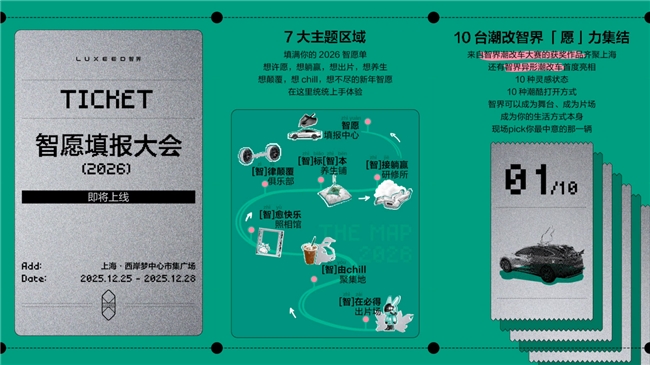 12月25日起,智界汽车在上海潮流新地标——西岸梦中心市集广场举办为期4天的「2026智愿填报大会」,将潮改车共创大赛获奖作品汇聚线下,集结10台潮改车与七大主题体验区,打造多元化都市互动场景,与都市先锋人群共创一场人-车-场深度融合的品牌事件。