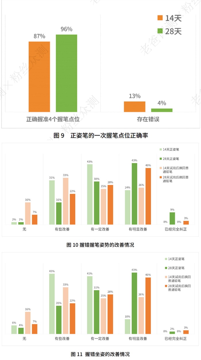 “老爸评测”针对 115名孩子做了为期 4 周的实测,样本覆盖 115 名 4-9岁儿童,试用周期28 天,测评产品为齐心集团自有品牌产品“Compera大小手正姿笔”。根据众测报告,该产品的使用性能重点看两个指标: