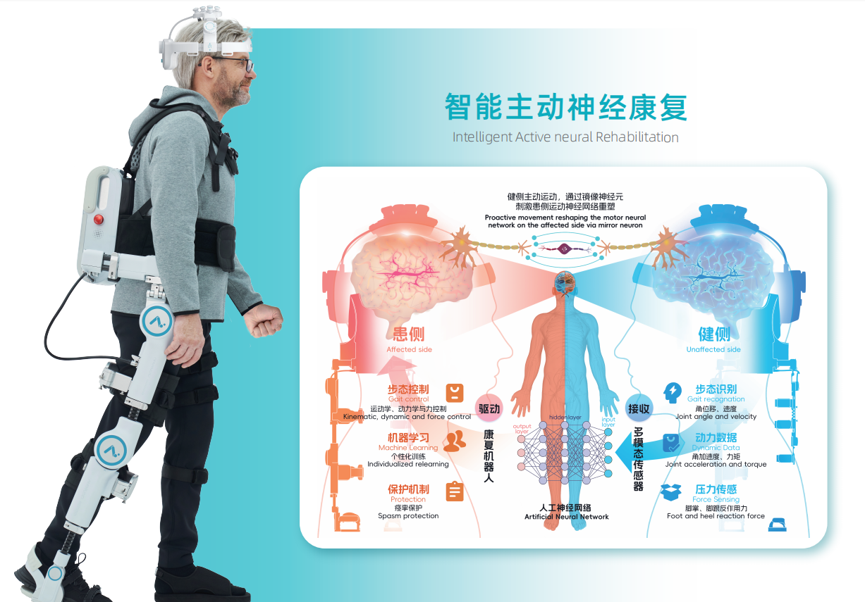 ExoMax®系列踝关节康复训练机器人,实现坐卧快速切换与健患侧联动,解决了踝关节功能障碍患者的精准康复需求;LiteStepper®单下肢康复机器人凭借“健侧引领患侧”的创新模式,助力偏瘫患者重建行走能力,斩获国际工业设计大奖;ExoPedia®儿童踝关节康复机器人,以趣味化交互设计适配低龄患者,填补了儿童康复智能设备的市场空白;ExoHug®上肢康复机器人搭载柔顺驱动与VR技术,实现三维空间多关节复合运动,成为康复科的“得力助手”;ExoMatrics®床旁康复机器人凭借六自由度驱动、一键操作优势,适配ICU及长期卧床患者需求;最新研发的脑机接口控制的单下肢智能康复机器人,突破性实现脑机交互闭环智能康复,通过运动认知融合技术,可有效促进患者神经控制功能重塑,助力偏瘫人群逐步恢复正常行走步态,重获卓越行动力与高品质生活。