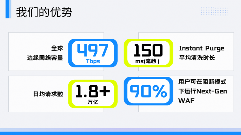 季常青Charlie:Fastly的核心是 “可编程边缘云平台”,不只是简单的内容分发。Fastly更像是一个 “智能边缘枢纽”,借助Instant Purge即时刷新技术,平均150ms能在全球即时清除缓存;比同行快32%的首字节到达时间(TTFB);能实时处理动态内容、API 请求和安全防护。拥有497Tbps的全球边缘网络容量,节点遍布全球6大洲的80+城市。Next-Gen WAF阻断模式、DDoS、Bots机器人管理等安全产品,让企业能精准防控DDoS、机器人及获得保护能力超出OWASP top10里的注入式WEB攻击等形式的威胁。