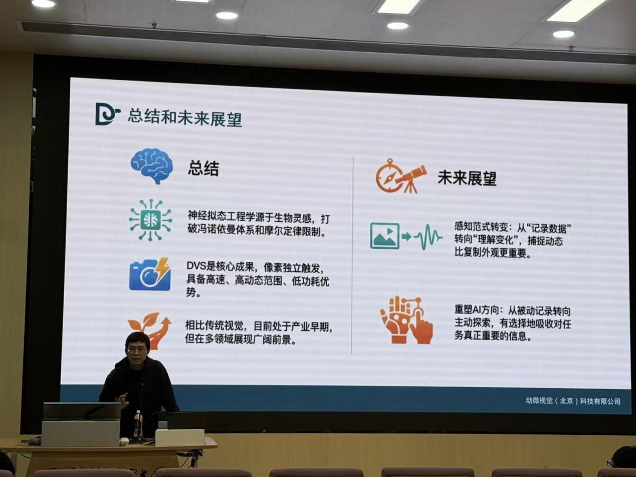 2025年12月12日晚,一场关于“神经拟态工程与DVS技术”的深度讲座在国科大MBA课堂引发热潮。动微视觉(北京)科技有限公司创始人兼CEO、杭州电子科技大学教授兼博士生导师刘敏作为主讲人以人类视网膜为灵感原点,层层剖析动态视觉传感器(DVS)如何通过仿生学设计突破传统成像瓶颈,为自动驾驶、工业检测、消费电子等领域注入新动能。本次分享不仅呈现了技术演进脉络,更展现了动微视觉(北京)科技有限公司在类脑计算赛道的前沿布局。
