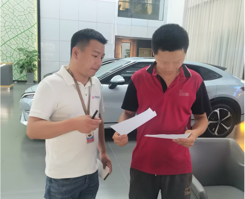 上图:易鑫金融顾问李松,正在帮客户讲解合同细节
