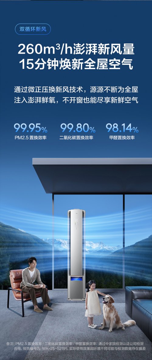 在AI净化风上,TCL小蓝翼P7 Ultra AI健康空调柜机的双循环新风实现了更加健康、高效的全域净化功能。它能以260m³/h澎湃新风量快速焕新全屋,高效置换PM2.5、甲醛与二氧化碳;一旦监测到室外污染严重,通过进风阀门切换内循环进风,将室内污浊空气高效过滤,通过265m³/h的洁净空气量,让空气更清新;而负离子瀑布净化功能,搭载12极离子发射器,释放亿级负离子团,快速电离空气中的病菌,高效清除细菌、病毒与污染物,持续为用户提供洁净、舒适的空气环境,开机只吹干净风。