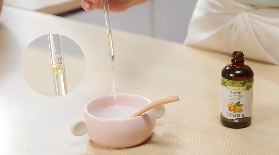 爷爷的农场拥有24000㎡自有生产基地,配备多个10万级净化车间、婴幼儿特殊膳食实验室与智能化高精度生产线,致力于围绕婴幼儿核心营养进行深入研究。以有机核桃油为例,品牌充分考虑婴幼儿脂肪吸收的特殊性,配方上为100%有机核桃油,亚油酸与α-亚麻酸比例约为5:1,契合《中国居民膳食指南》的科学推荐。这份不妥协的匠心,同样体现在看得见的细节上:采用避光的棕色玻璃瓶保护营养活性,设计定量装置方便精准喂养,确保宝宝摄入的每一口营养都“刚刚好”。