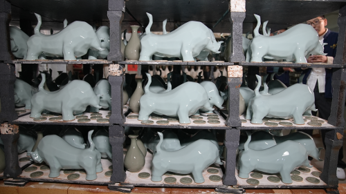 天青劲牛摆件:以简洁线条勾勒牛的雄健姿态,天青色釉面温润如玉,开片纹路灵动,适合陈列于办公室或客厅,彰显格局却不张扬;