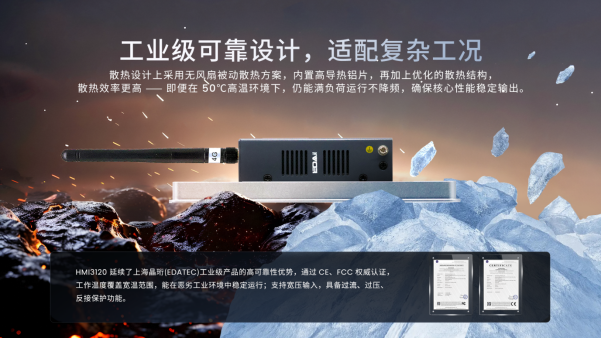 HMI3120延续了上海晶珩工业级产品的高可靠性优势,通过 CE、FCC权威认证,工作温度覆盖宽温范围,能在恶劣工业环境中稳定运行;支持宽压输入,具备过流、过压、反接保护功能。