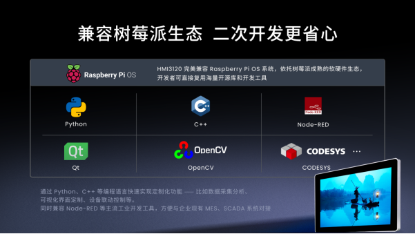 HMI3120 完美兼容 Raspberry Pi OS 系统,依托树莓派成熟的软硬件生态,开发者可直接复用海量开源库和开发工具,通过 Python、C++ 等编程语言快速实现定制化功能 —— 比如数据采集分析、可视化界面定制、设备联动控制等。同时兼容 Node-RED 等主流工业开发工具,方便与企业现有 MES、SCADA 系统对接。