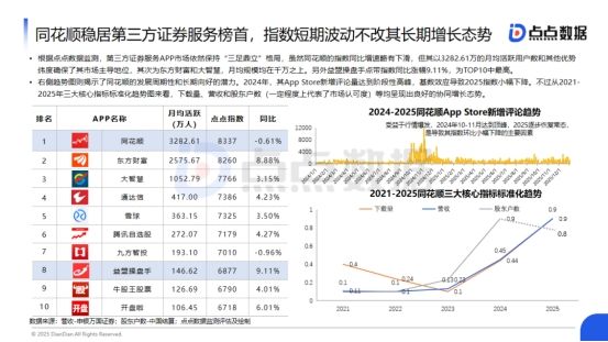 数据来源:点点数据近年来,券商行业技术投入持续增加,大量的资金投入推动了证券服务APP功能的不断升级和完善,尤其是头部券商,促使头部APP在稳定性、智能化、服务能力上逐渐展现优势。同花顺稳居第三方证券服务榜首,指数短期波动不改其长期增长态势根据点点数据监测,第三方证券服务APP市场依然保持“三足鼎立”格局,虽然同花顺的指数同比增速略有下滑,但其以3282.61万的月均活跃用户数和其他优势维度确保了其市场主导地位,其次为东方财富和大智慧,月均规模均在千万之上。另外益盟操盘手点带指数同比涨幅9.11%,为TOP10中最高。