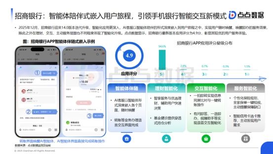 进一步从月均下载量、近1年版本更新次数和版本评分等维度,TOP10 APP画像特征差异明显:如动卡空间更新次数断层领先,是第二名的近两倍;兴业生活则“偏科”明显,下载和版本更新数量中等,用户评分倒数第二;而建行生活用户基数庞大,为当之无愧“人气大哥”,体验优化动力相对不足,用户评分持续偏低。招商银行:智能体陪伴式嵌入用户旅程,引领手机银行智能交互新模式2025年12月,招商银行迎来14.0版本迭代升级,智能化应用更深入,AI客服以智能体陪伴的形式深度嵌入到用户旅程之中,实现用户随时唤醒、唤醒即办的服务效果,除此之外在理财、交互、主动服务层面也不同程度体现了智能化升级。点点数据显示,招商银行最新版本应用评分为4.9分,彰显其较优的用户服务体验。