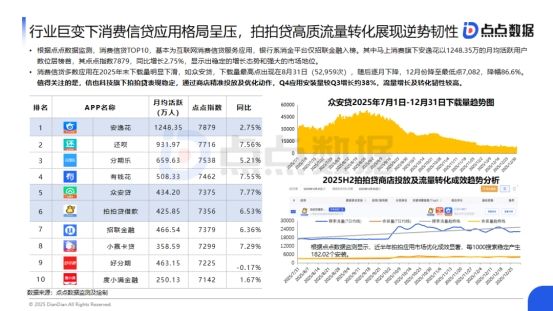 监管助贷新规有力重塑市场生态,消费信贷APP下载量半年锐减41.8%中国消费信贷APP下载量在2024年1月至2025年7月总体强劲,在7月达到峰值2892.4万次。然而,自2025年8月起,下载量开始呈现持续下滑趋势:8月至10月(政策酝酿期至落地): 市场对新规的预期和适应开始显现,下载量从峰值开始回落,连续5个月下滑,从最高2835万次月下载降至12月的1684万次,锐减41.8%,显示了政策对市场生态的重塑作用。