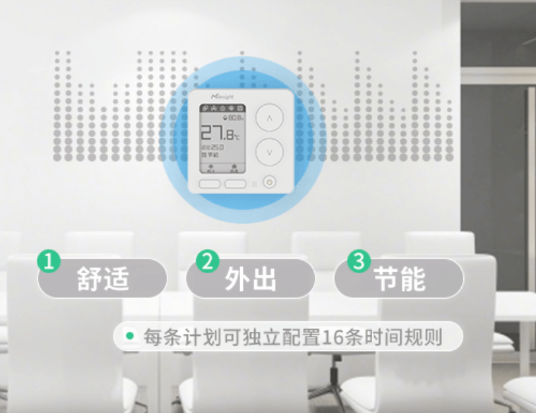 在炎炎夏日场景中,实现室内温度的智能调节与精准控温,对人体健康保障、建筑节能环保及延长制冷设备寿命具有重要意义。智能风机盘管温控器作为精准控制室温、提升体感舒适度的重要设备,依托高精度传感器,实时精准监测室内环境温湿度变化并快速响应,精准调节冷/ 热量输出量,保障环境舒适度的同时提升能源效率,降低碳排放强度,助力实现 “双碳” 目标。