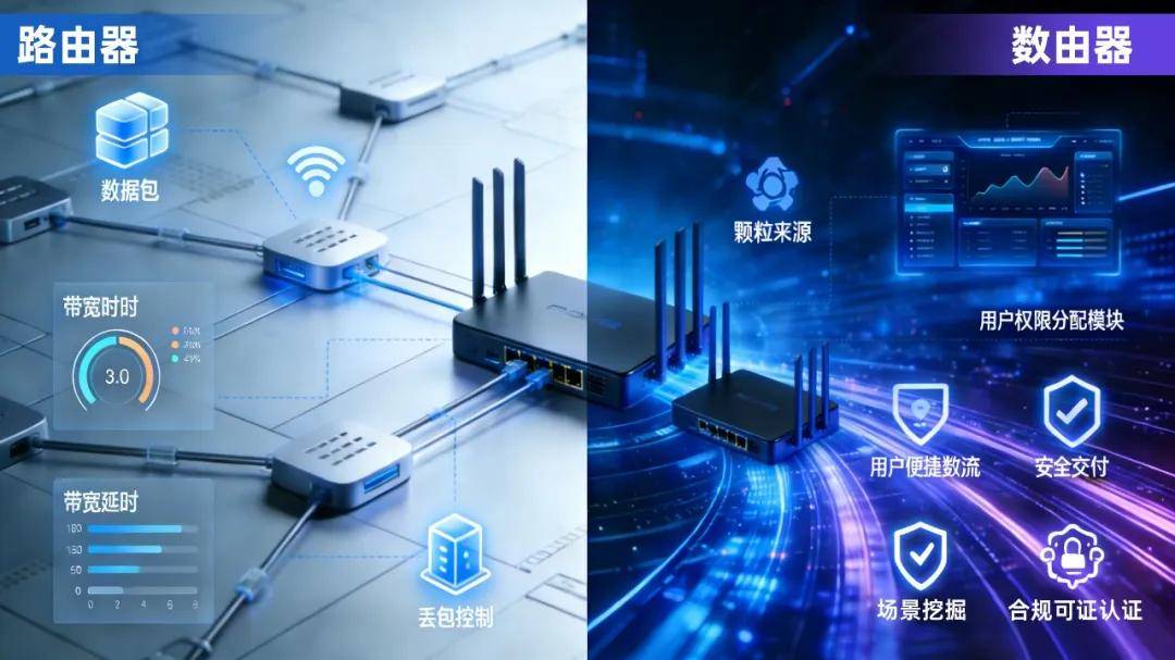 因此可以把它们理解为:路由器解决“比特怎么跑得快、跑得通”,数由器解决“数据怎么跑得对、跑得稳、跑得可信、跑得安全”。