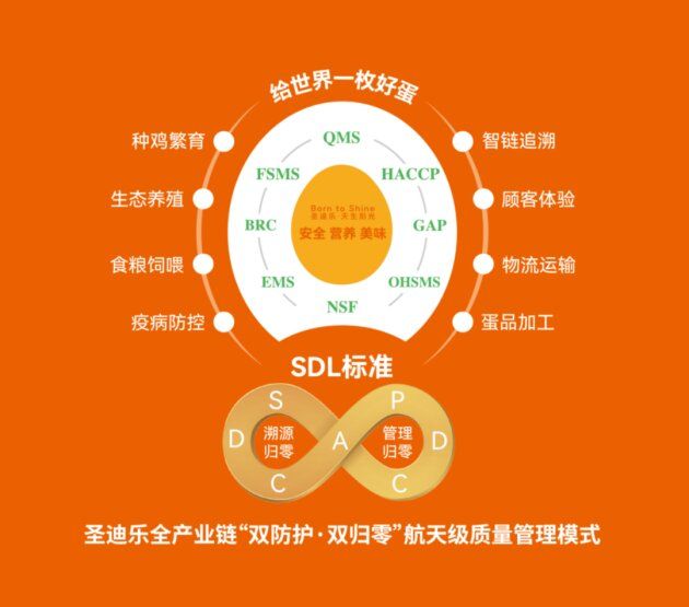 作为中国航天事业合作伙伴的唯一蛋品品牌,铁骑力士圣迪乐独创了全产业链“双防护·双归零”航天级质量管理模式。该模式依托航天技术质量标准,通过体系化认证集群建立静态防护网,结合SDL标准构建全产业链动态防护链,创新“溯源归零”与“管理归零”的问题闭环处理方法,实现了从源头到终端的全链条风险防控,确保每一枚鸡蛋都达到航天级品质标准。