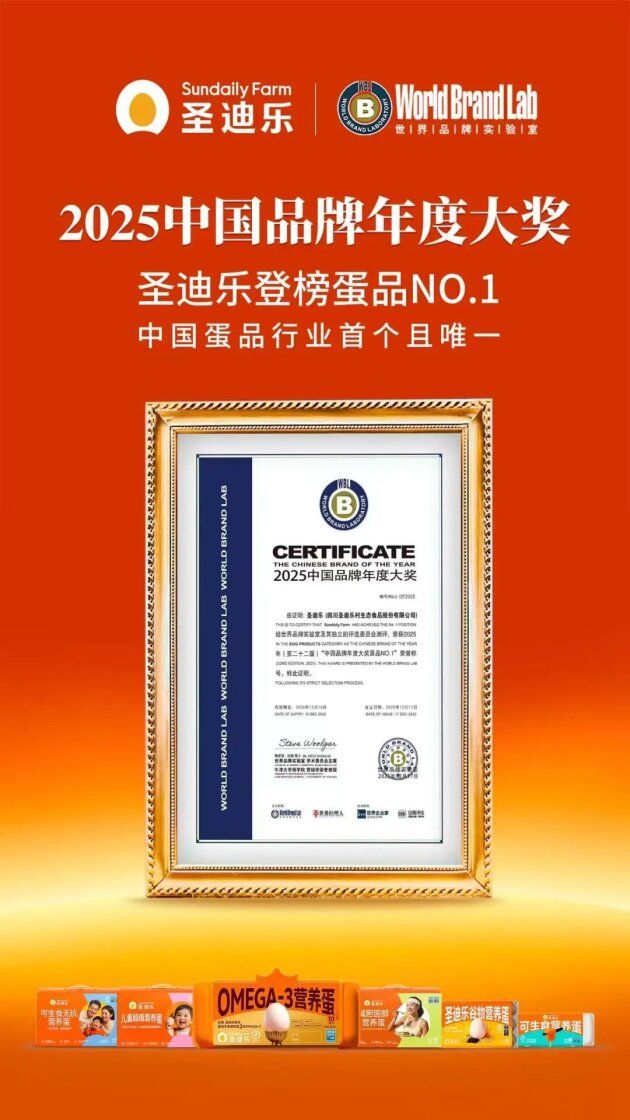 12月17日,worldlab(世界品牌实验室)发布,圣迪乐荣获2025中国品牌年度大奖蛋品NO.1