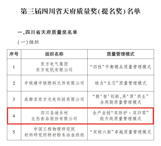 近日,四川省人民政府正式公布第三届天府质量奖获奖名单,省工商联副主席企业、四川铁骑力士实业有限公司控股企业——四川圣迪乐村生态食品股份有限公司(以下简称“圣迪乐”)榜上有名。