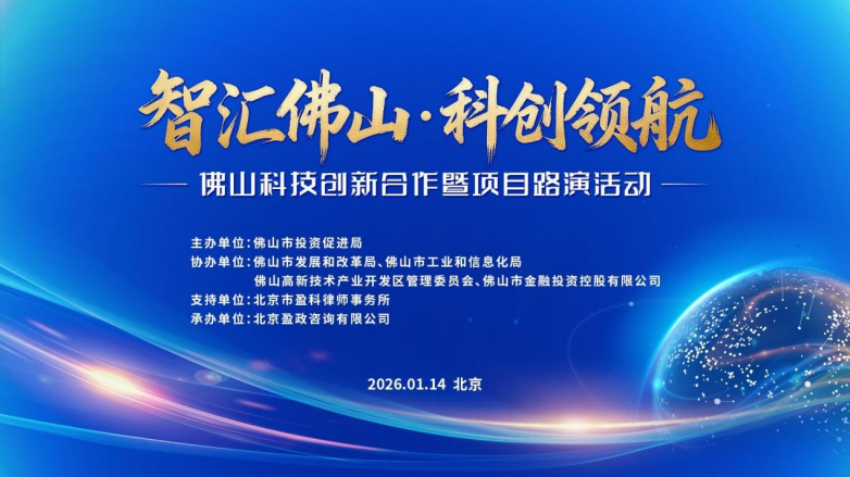 2026年1月14日,由佛山市投资促进局主办,佛山市发改局、佛山市工业和信息化局、佛山高新区管委会、佛山金控协办,北京盈政咨询有限公司承办的“智汇佛山·科创领航”佛山科技创新合作暨项目路演活动在北京正大中心举行。