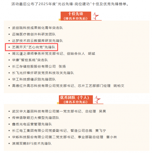 1月15日下午,经上级单位推荐、区级初筛,艺画开天“艺心向党”先锋队从281家单位中脱颖而出,经路演评比,荣获评分第二的好成绩,被武汉东湖新技术开发区工作委员会组织部授予东湖高新区2025年“光谷先锋•岗位建功”活动十佳先锋团队。