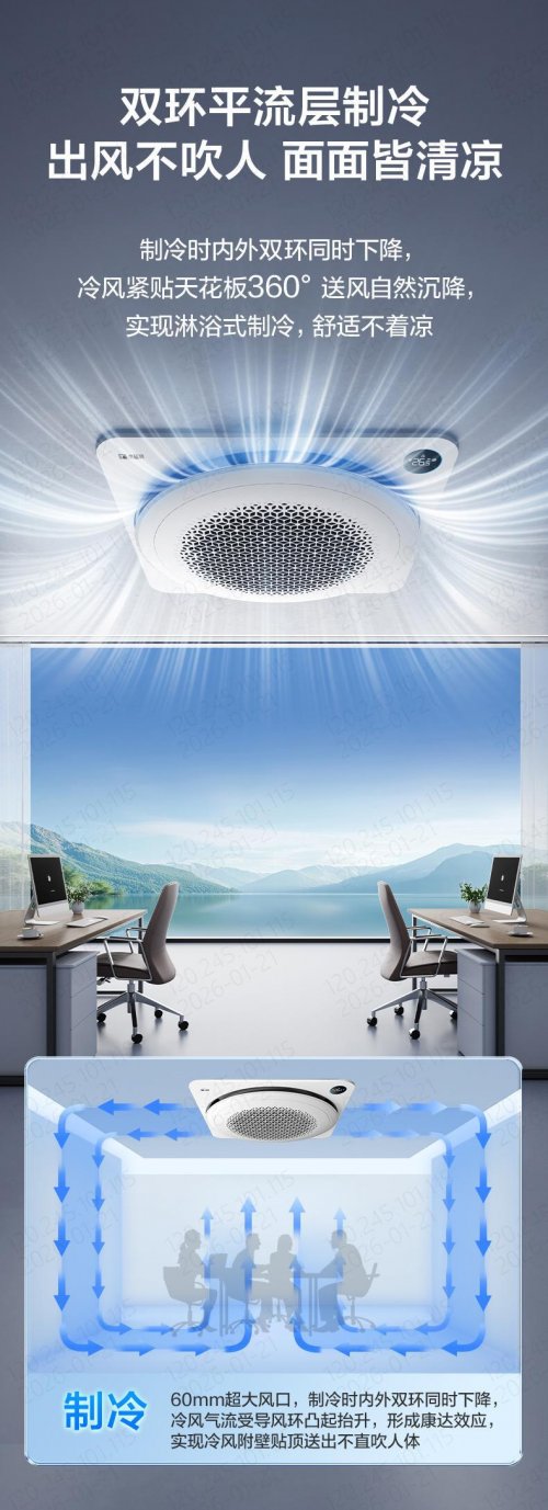 传统中央空调,尤其是天花机,长期存在诸多用户痛点:冷风直吹带来不适,制热时热空气难以有效抵达脚底形成“头热脚冷”,以及风道细菌滋生产生异味等。小蓝翼天花机以其行业首创的创新圆形导风环设计,为用户带来全域舒适风。