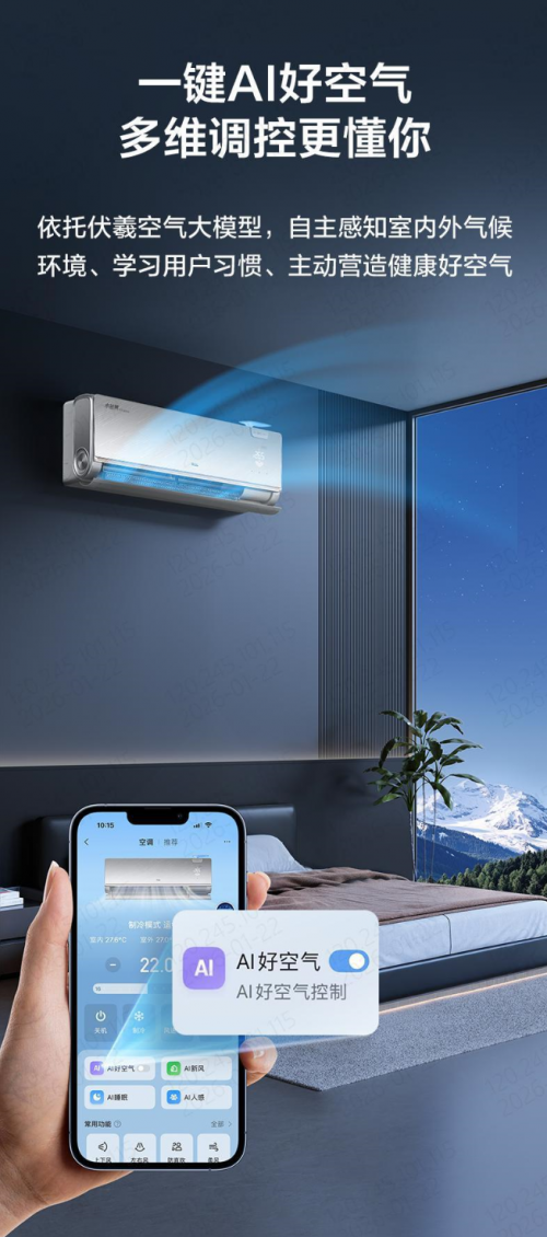 其中一键 AI 好空气功能依托伏羲空气大模型,能自主感知室内外气候环境,学习用户使用习惯,主动营造适配的健康空气环境。智柔风 5.0技术通过左右扫风打孔叶片和双层柔风环导风板,根据环境温差自动调控柔风模式,彻底告别直吹不适,让送风更柔和、体感更舒适。